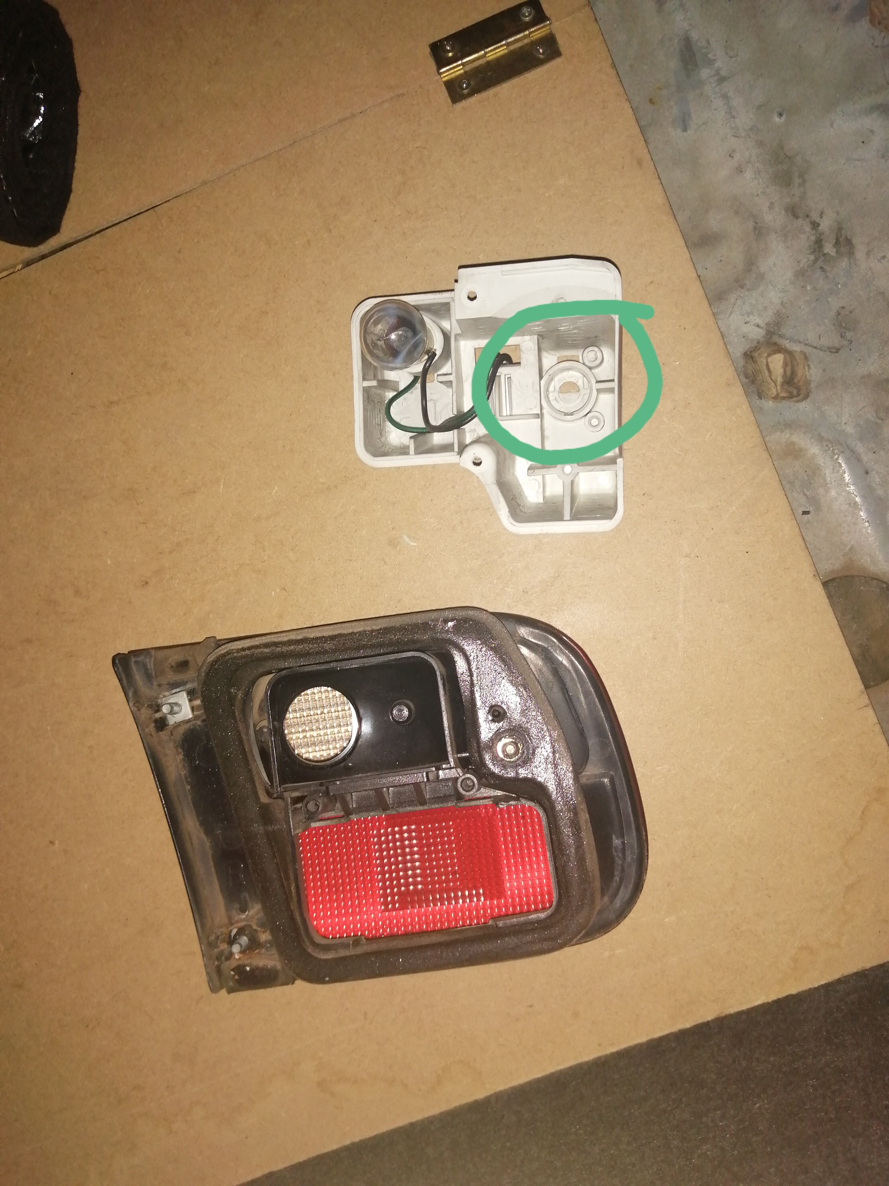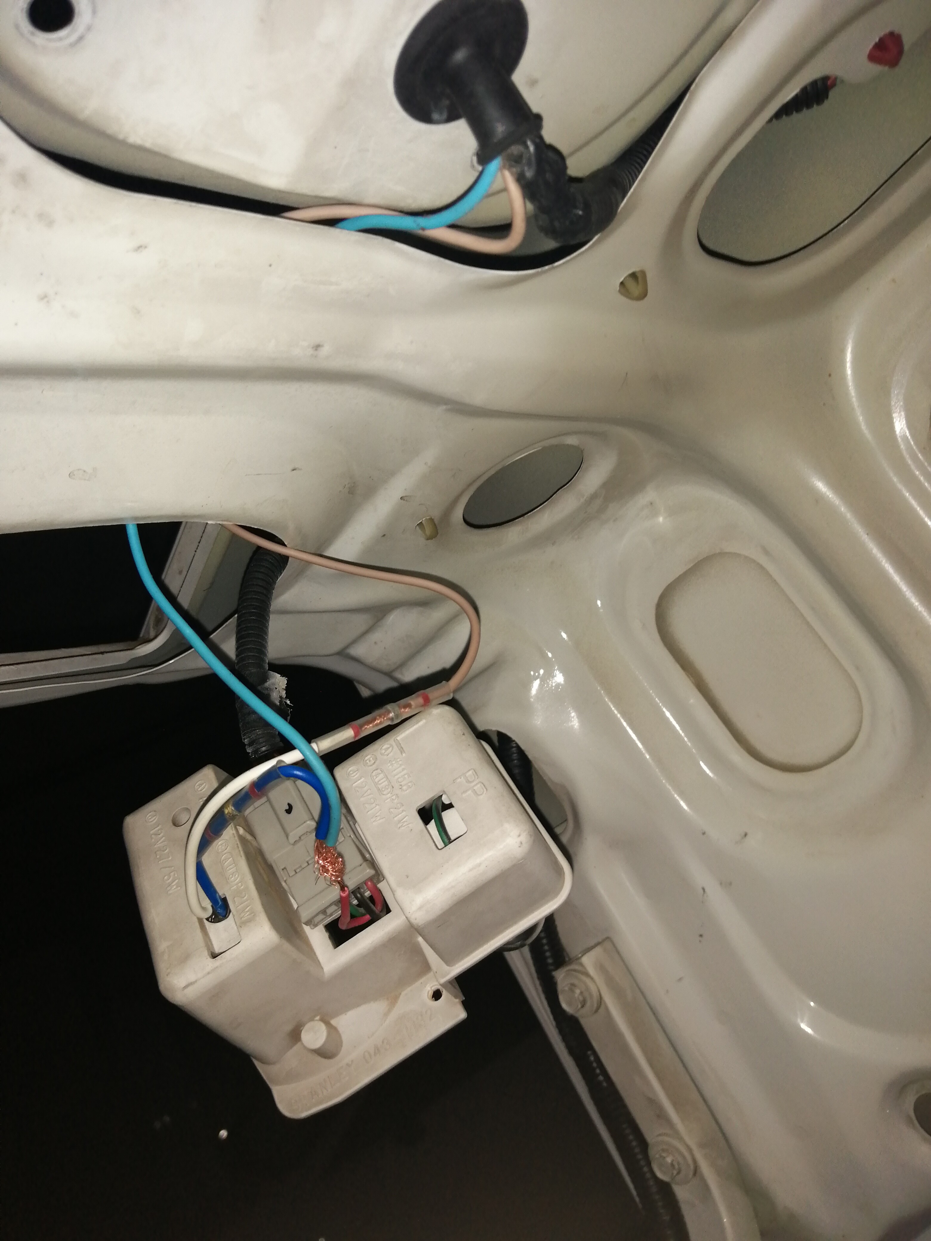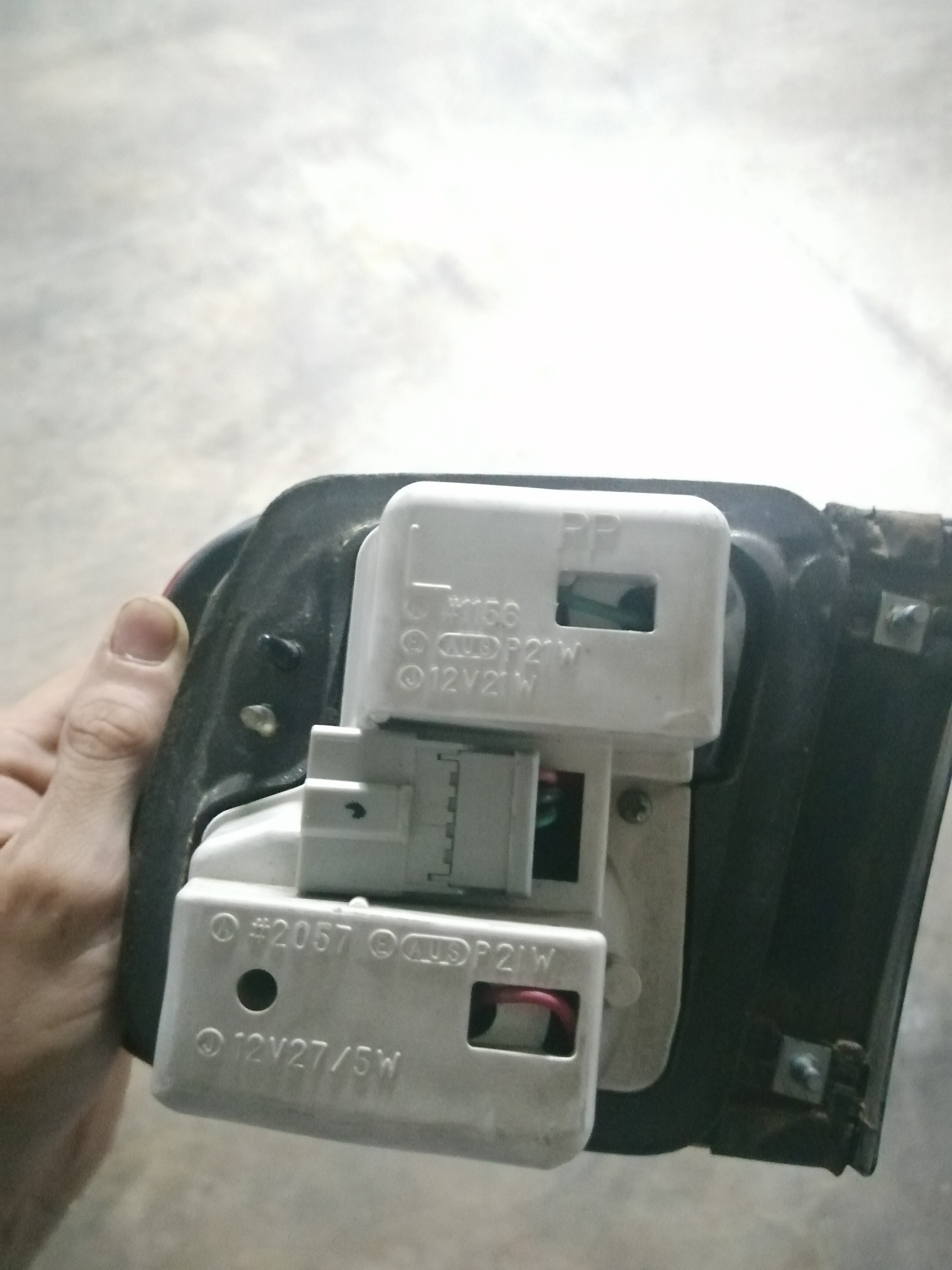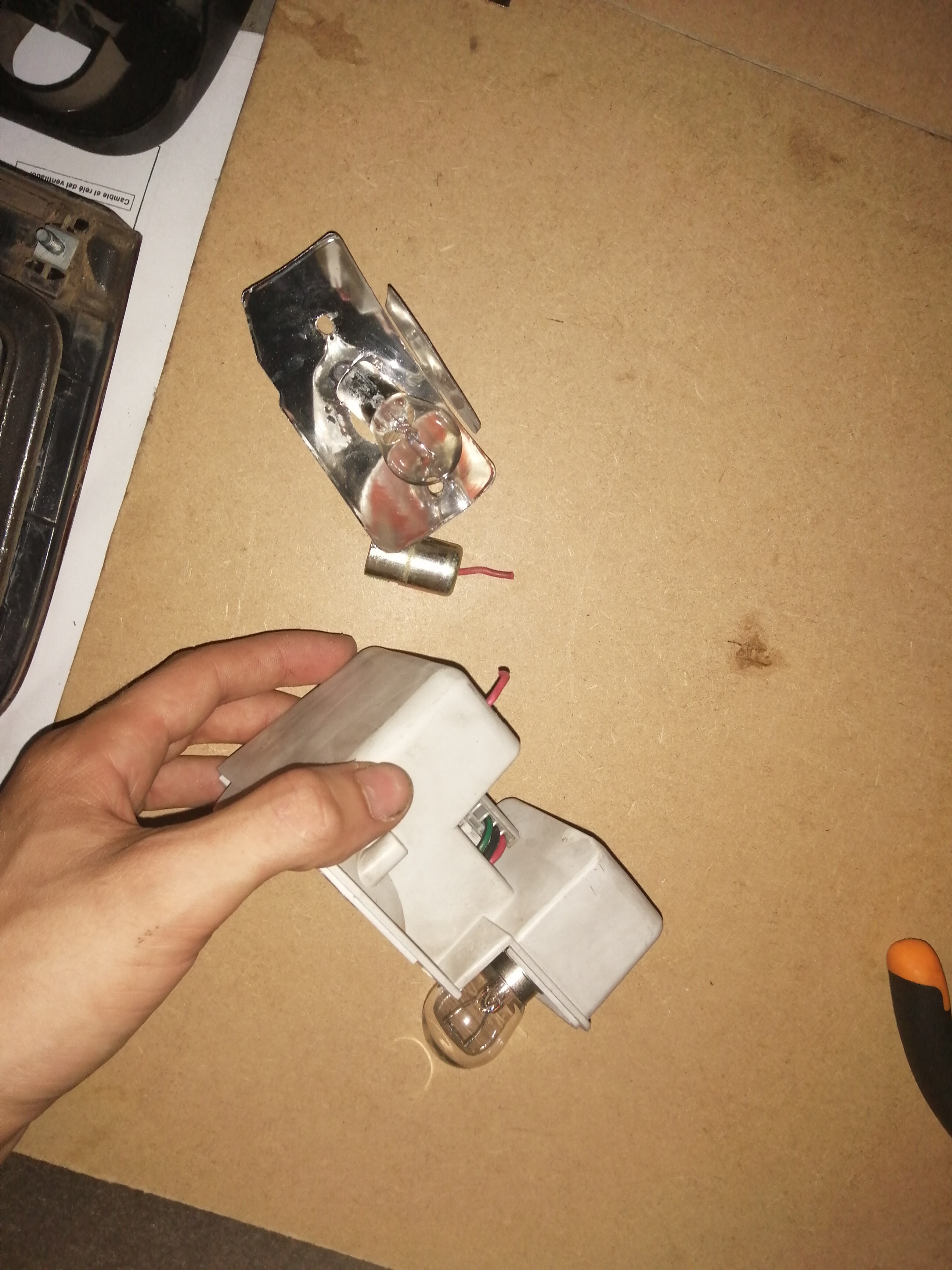 Lo siguiente que hice fue preparar el otro foco, para ello corté el positivo del casquillo de un polo del antiniebla, saqué el casquillo, puse el nuevo y empalmé provisionalmente uno de los cables al positivo del antiniebla y otro a la luz de matrícula, para probar cual era el de 5w y cual el de 21w, en mi caso el azul oscuro era el de 21w(antiniebla) y el blanco el de 5w(posición).