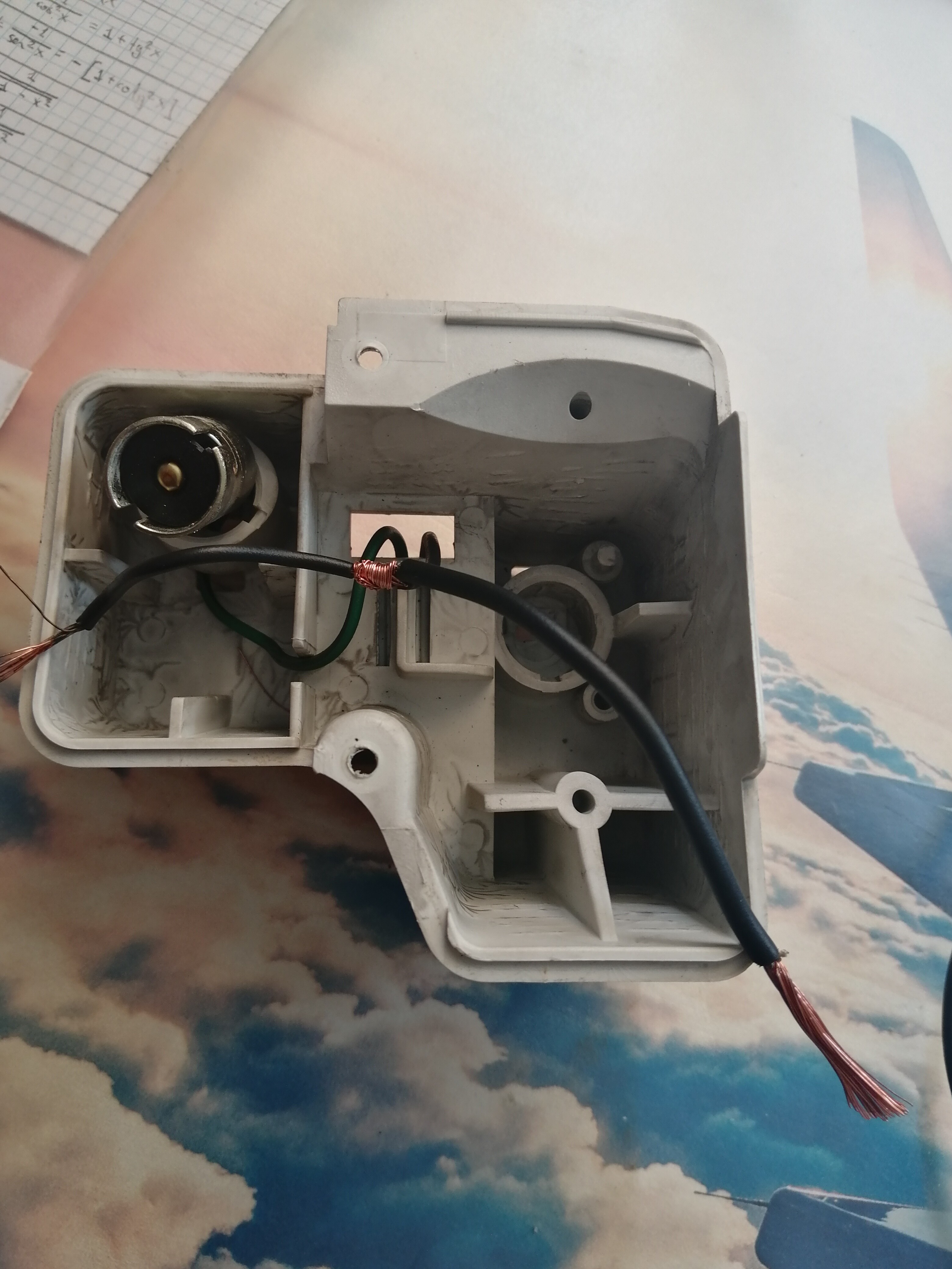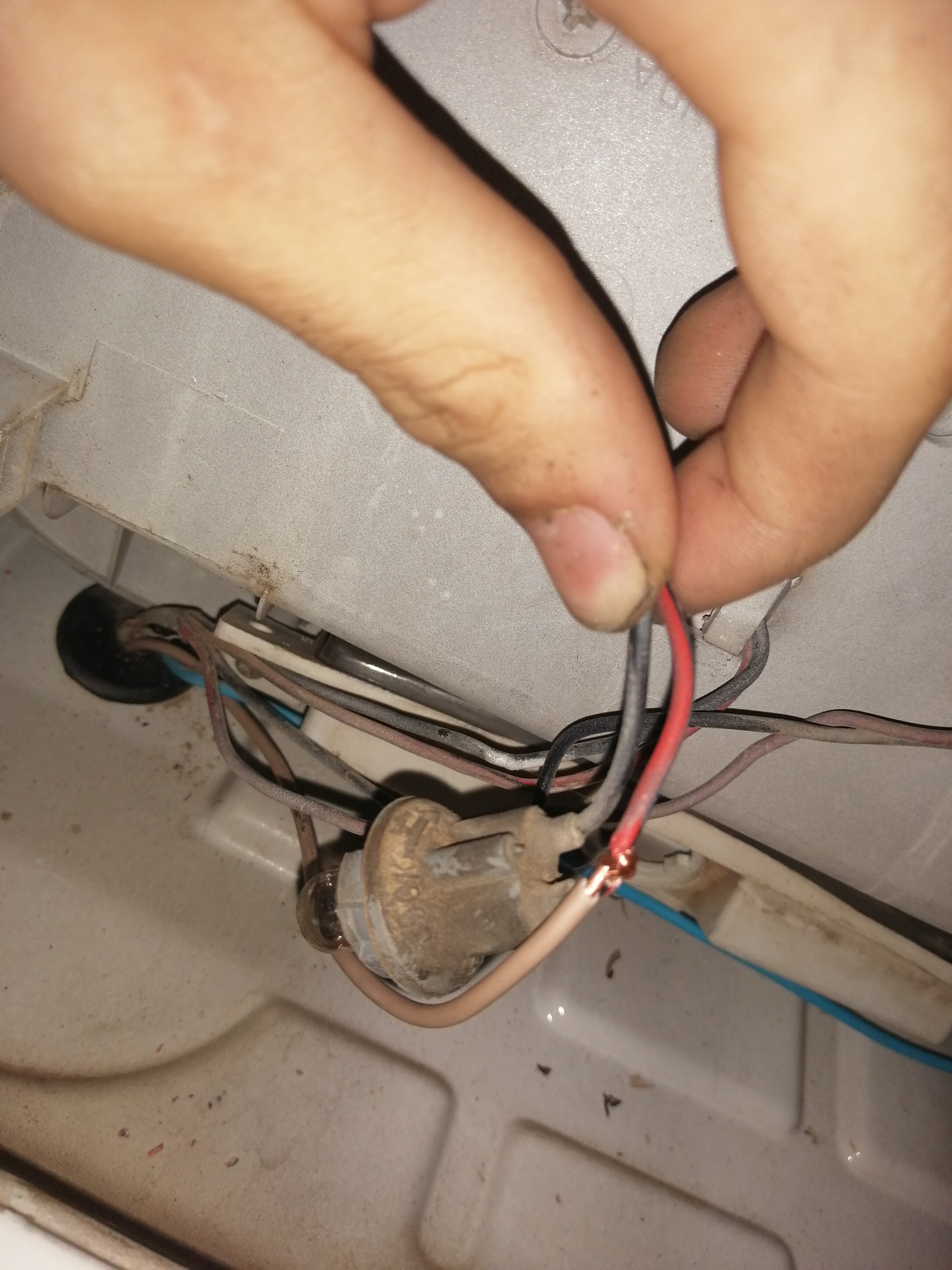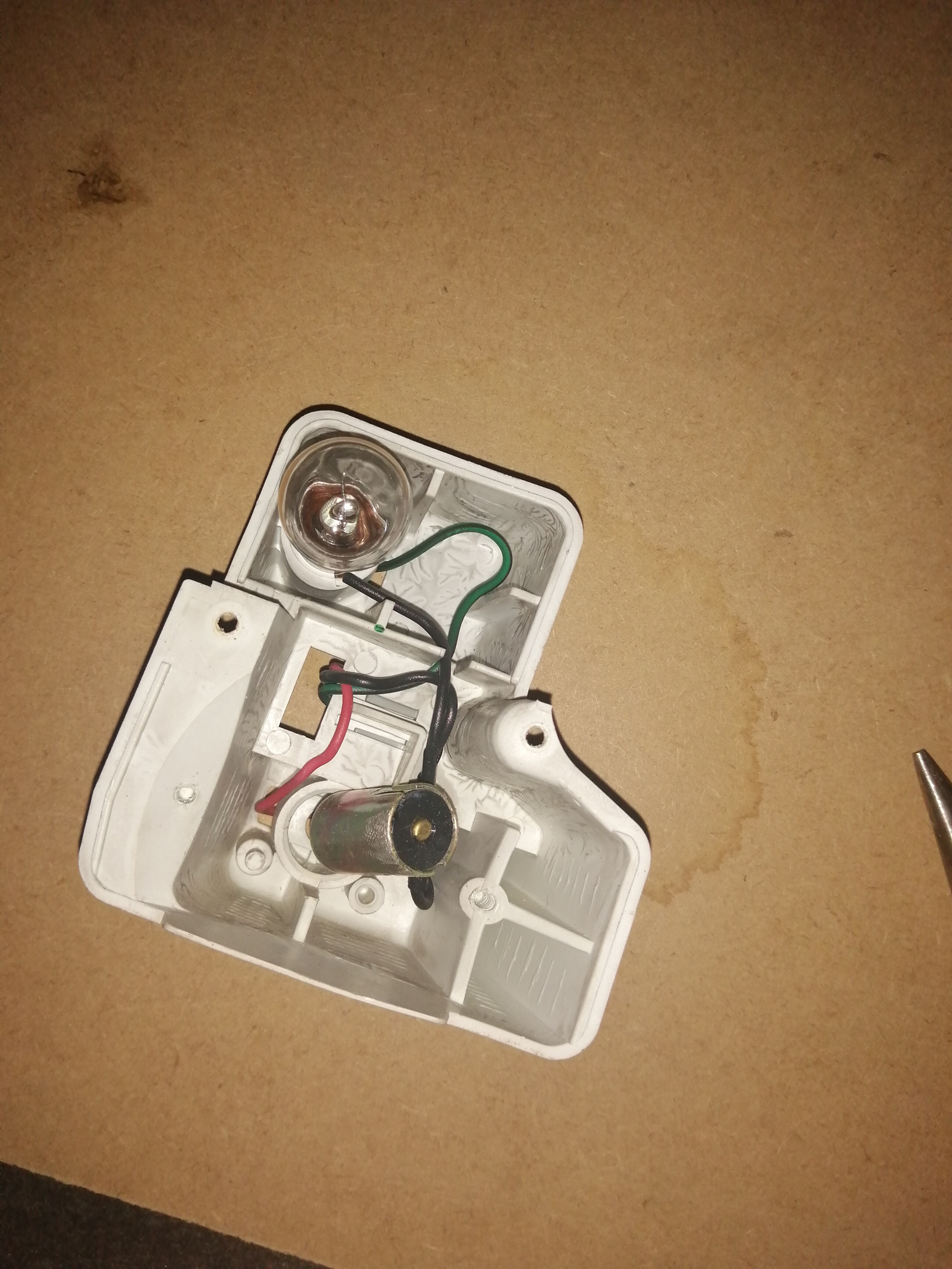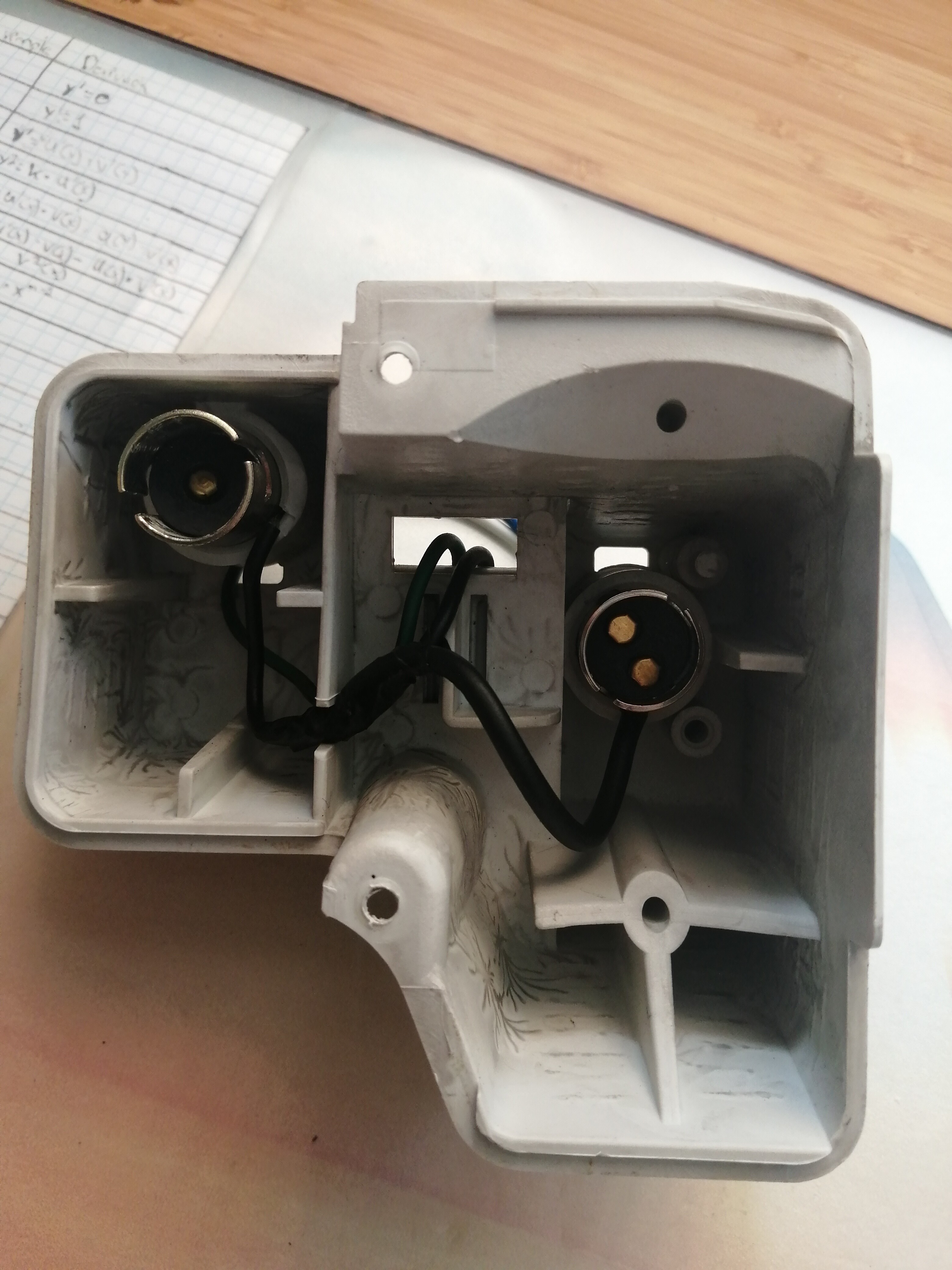 Lo siguiente que hice fue preparar el otro foco, para ello corté el positivo del casquillo de un polo del antiniebla, saqué el casquillo, puse el nuevo y empalmé provisionalmente uno de los cables al positivo del antiniebla y otro a la luz de matrícula, para probar cual era el de 5w y cual el de 21w, en mi caso el azul oscuro era el de 21w(antiniebla) y el blanco el de 5w(posición).