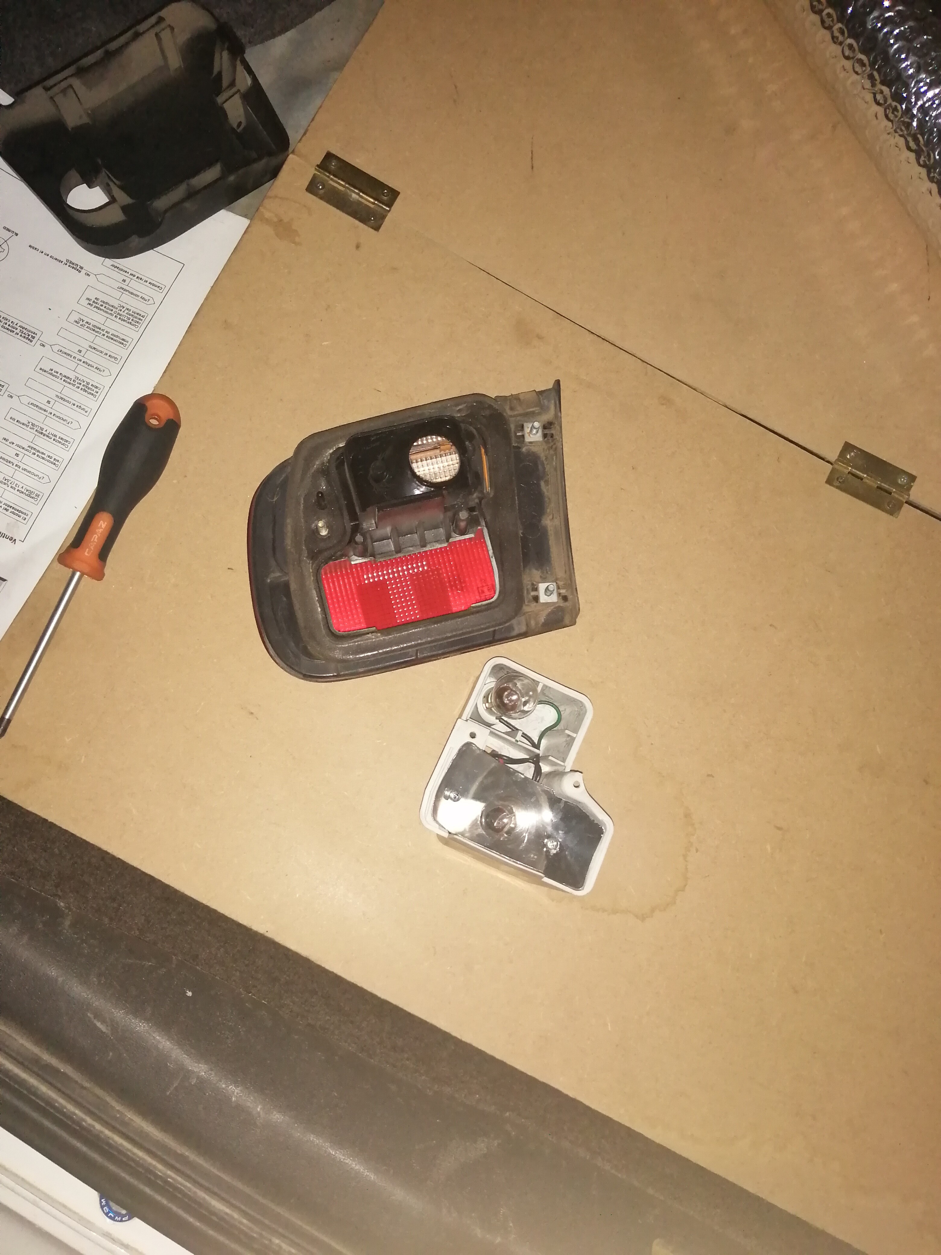 Pues nada lo primero es empezar a desmontar los pilotos, llevan dos tornillos como de plástico a los laterales y una tuerca en el centro.