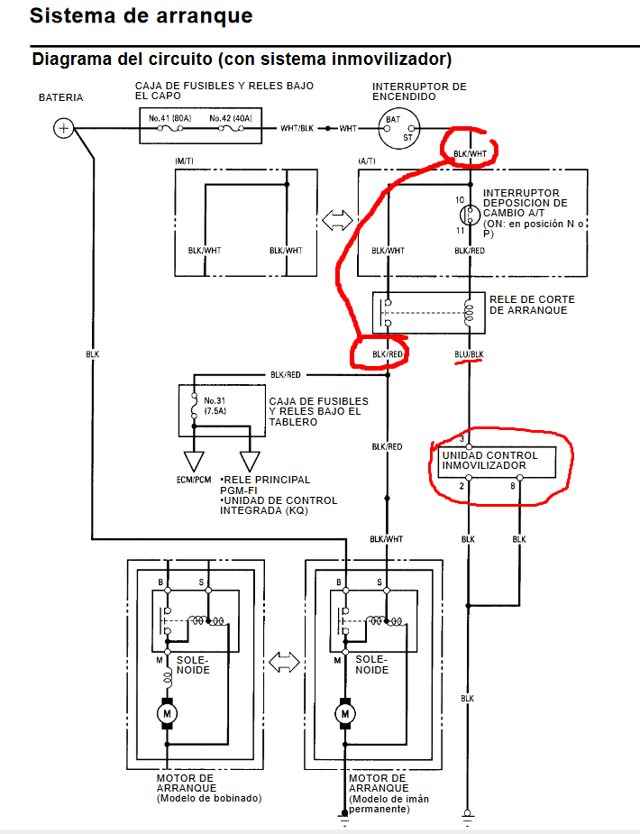 Justo después de postear encontré el programa de la honda de manuales de mantenimiento y encontré ese mismo esquema y vi que se necesitaba el inmovilizador para dar la masa. Ahora la idea es puentear directamente en el conector del inmovilizador o meterle una masa directa al relé.