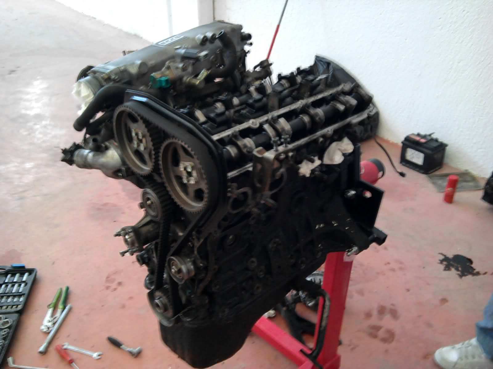 Pues no seguí desmontando porque gire el motor para dejarlo inclinado y sacar los colectores y turbo y como ahora el reparto de pesos esta muy desesquilibrado (toda la admision debajo y nada arriba) no tuve huevos a girar el motor, vamos no tuve huevos porque no conseguía hacer suficiente fuerza para sacar el tornillito que hace de tope para que el motor este quieto, no podia hacer palanca y sacar el tornillo a la vez jejeje.