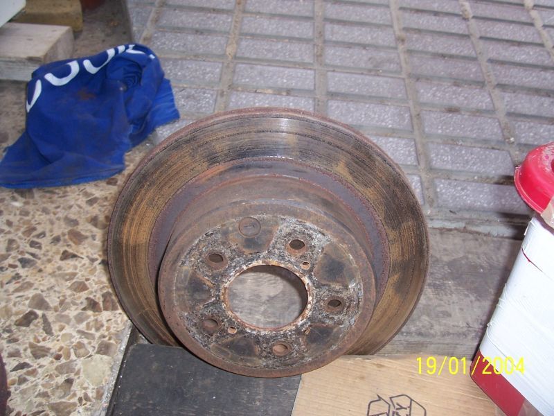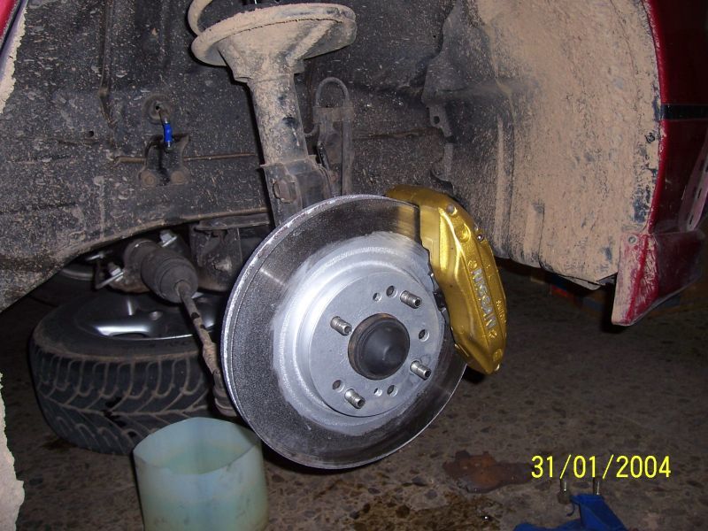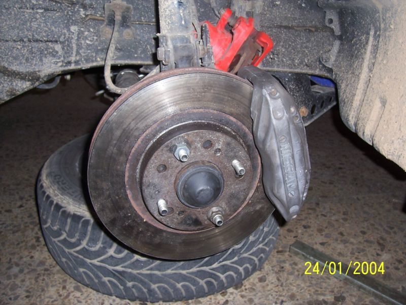 I aqui ya viene la primera ida de olla xDD conversion de frenos completa de r33 gtst, discos de 290 o 300 no lo se exactamente pero son muy gordos, pinzas de freno delanteras de 4 pistones, traseras ed 2 pistones, pastillas de freno i cable del freno de mano