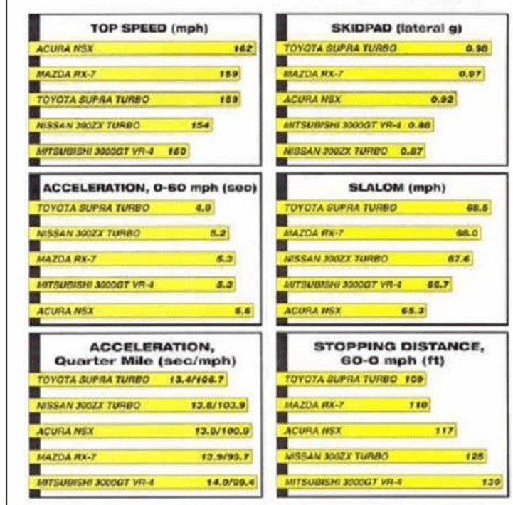 Según lo que yo se, o creo que se, lo de que un Supra tenia que andar más, no es así. El único que no va limitado es el NSX y por eso es el que mas velocidad punta tiene. El Supra, el ZX, el 3000 GT van limitados. Y el RX7 me parece que tampoco va limitado, este último no lo sé bien…El 3000 GT es mas pesado con la traccion total y tal, no es raro que no sea de los más rápidos…