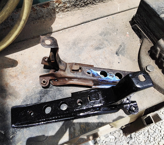 En la foto se ven solo loa soportes traseros, aunque trabajé los cuatro. Hay uno terminado y otro al que tan solo le he quitado un poco el oxido, se puede ver la diferencia.