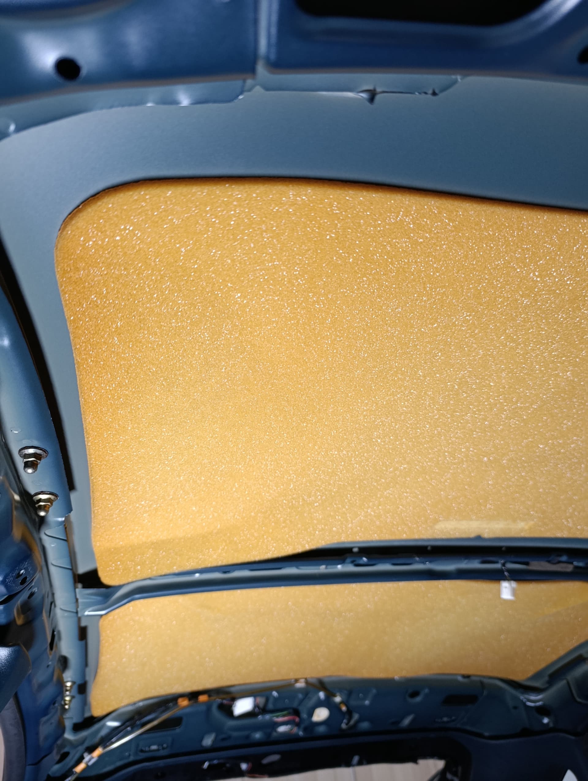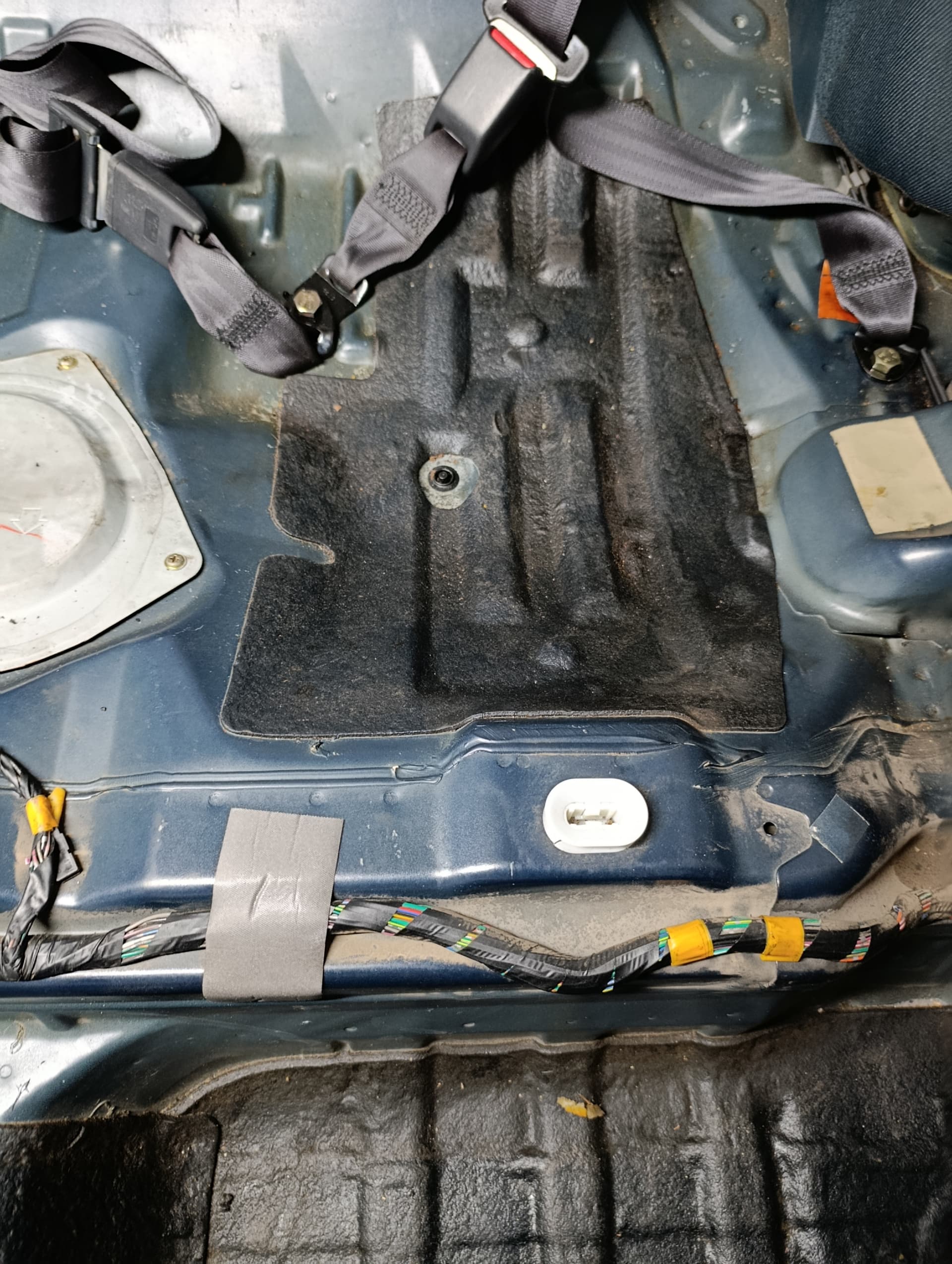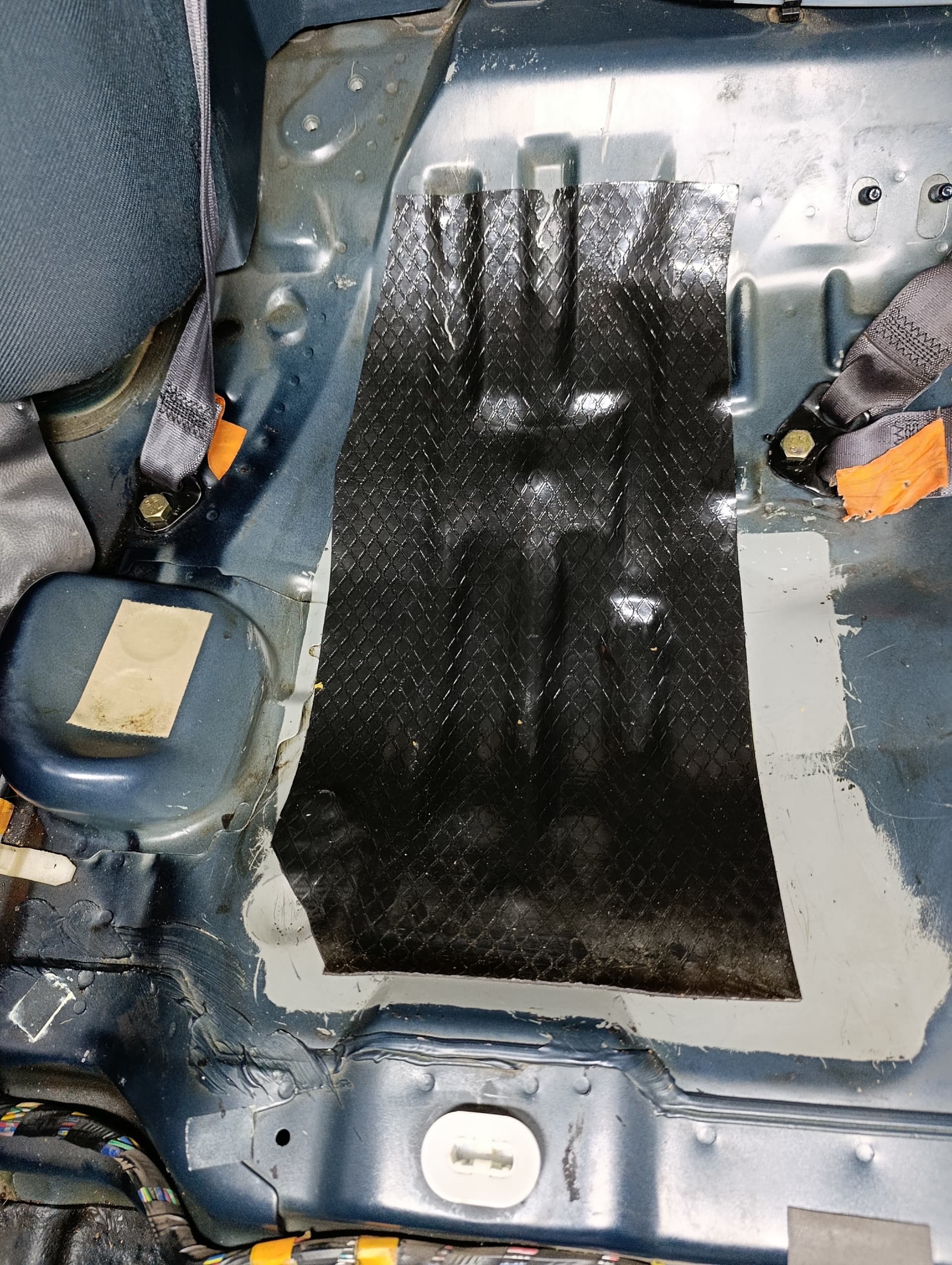 En algún momento se les derramó aceite que llevaban en el maletero y se quedó en el culo del asiento trasero lado derecho, después de limpiar todo bien, la lámina antivibración se desintegraba.