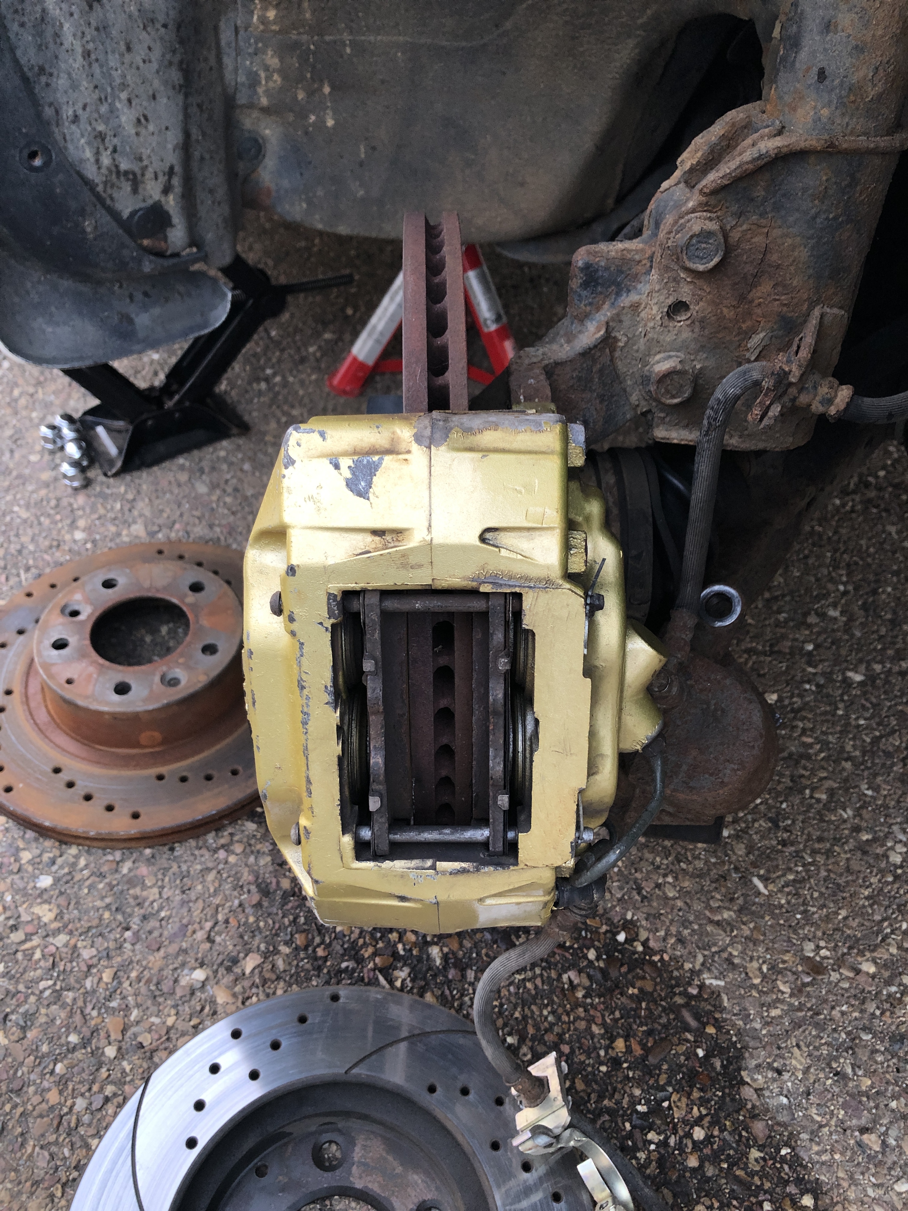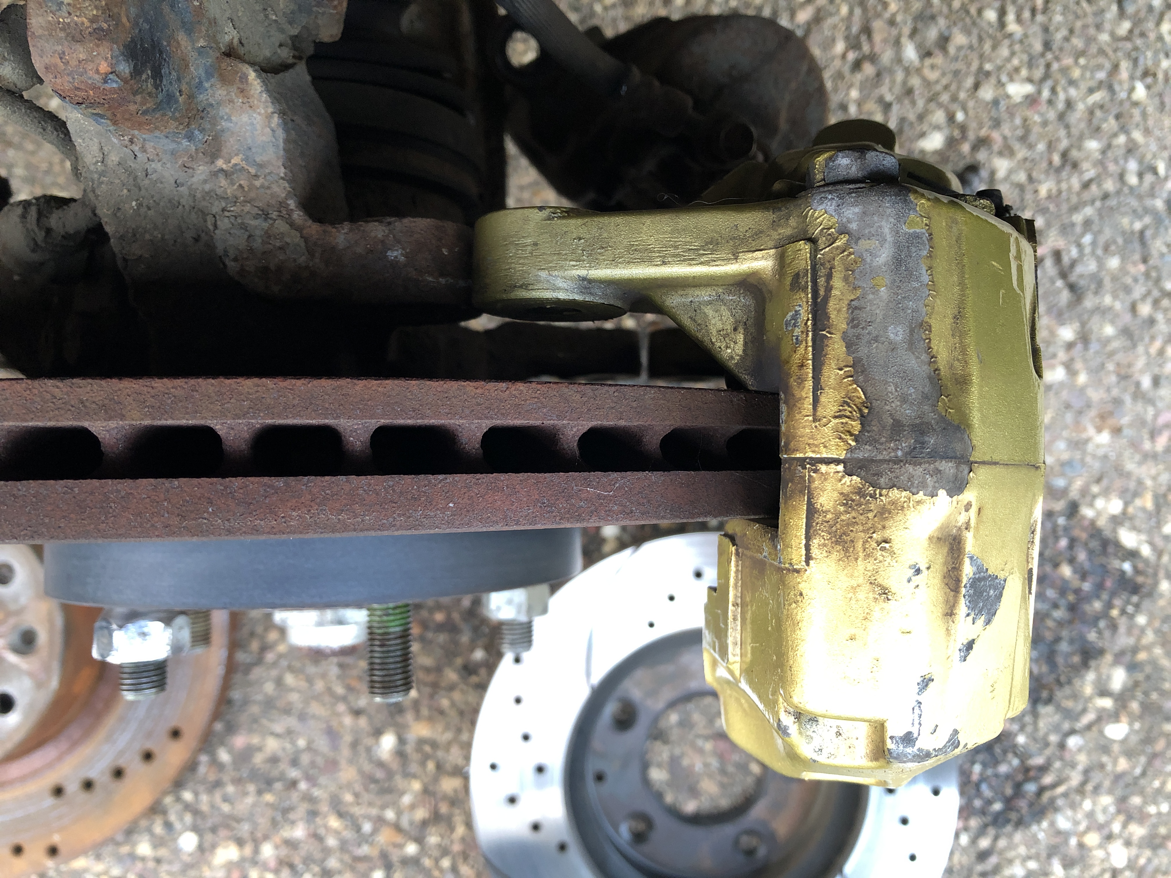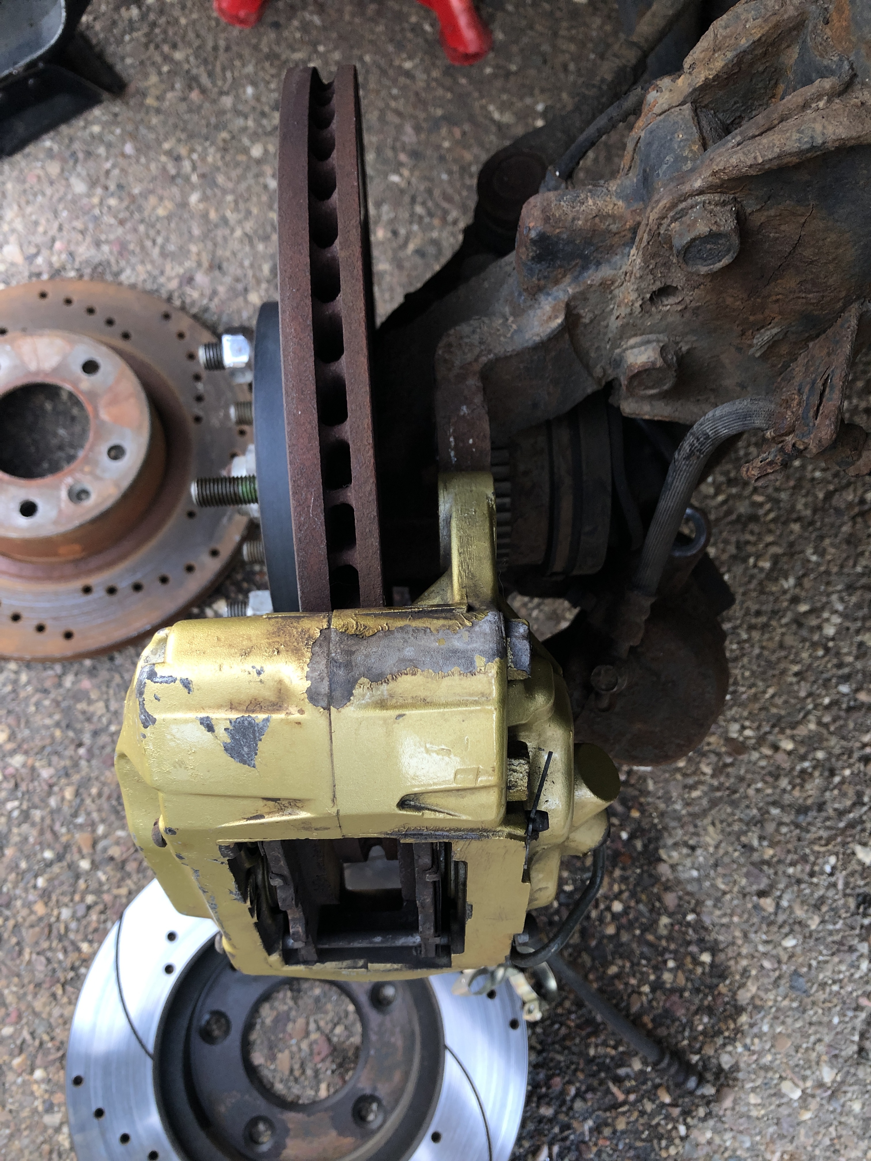 Bueno pues segundo dia de pruebas y hoy hemos puesto la pinza como normalmente va de origen, aprovechando las sujeciones de la mangueta donde va anclado el soporte de la pinza original.
