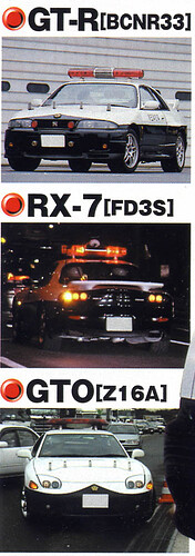la primera foto de todas , del Sky ensanchado, no es un coche real de policia, es para la promo de un juego de coches de poli q solo salio en Japon, vendria a ser como el RX8 turbado para la promo del NFS ![]()