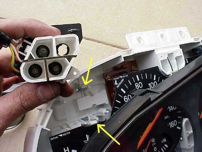 Here is a good link to gauge cluster removal. You can see in the final pics of that link that there are bulbs visible behind the gauge cluster. Unfortunately, none of those bulbs match up to our problem bulb in the picture above. In order to access that bulb, the clear plastic lens cover has to be separated from the white plastic back of the instrument cluster.