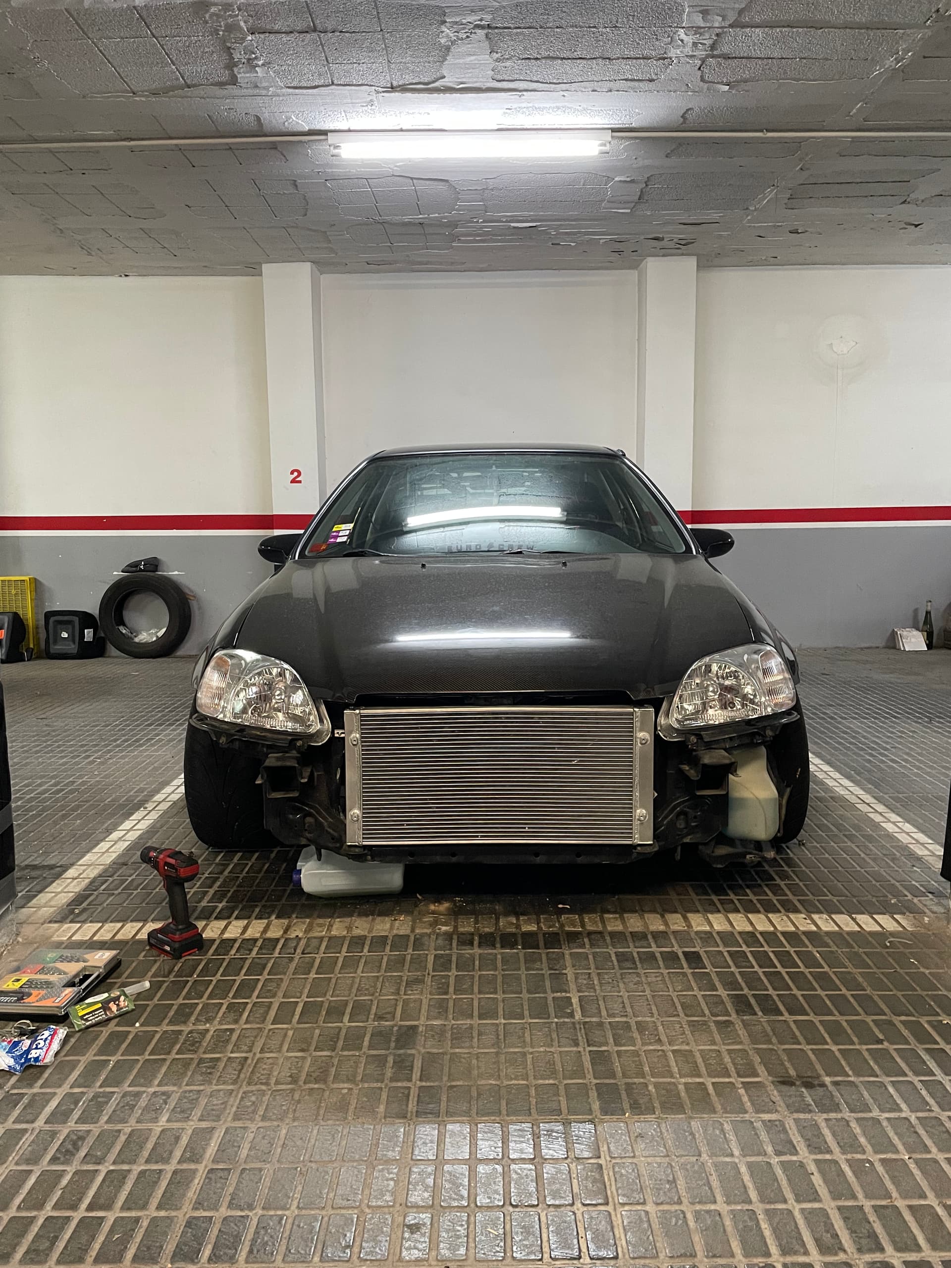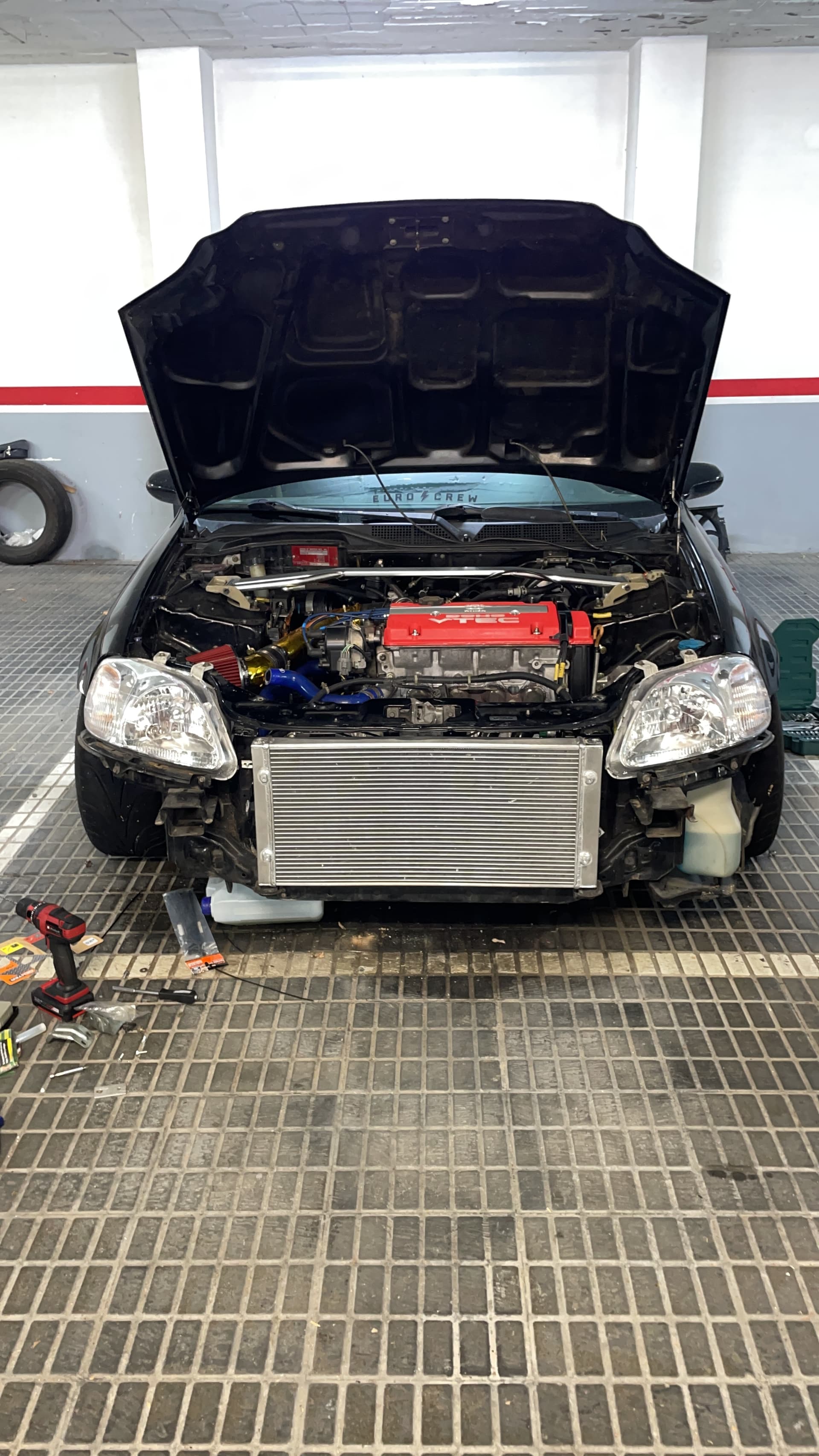 Mirando por wallapop me encuentro un despiece de un civic ek turbo que vendía radiador de aluminio y electros. Hablando con el chico y tal me encajaba de medidas y me decido a comprarlo. El radiador lo llevaba montado delante de la “vigueta” que aguanta la cerradura del cap. Tuve que cortar ese hierro, y crear soportes para poder montarlo. Desmonte los que llevaba de serie por detrás y los monte delante y con un par de refuerzos esta perfecto. También tuve que cortar bastante el interior del paragolpes porque me tocaba con el radiador, recolocar el tapón de llenado del radiador. Dejo alguna foto por si no me he explicado bien.