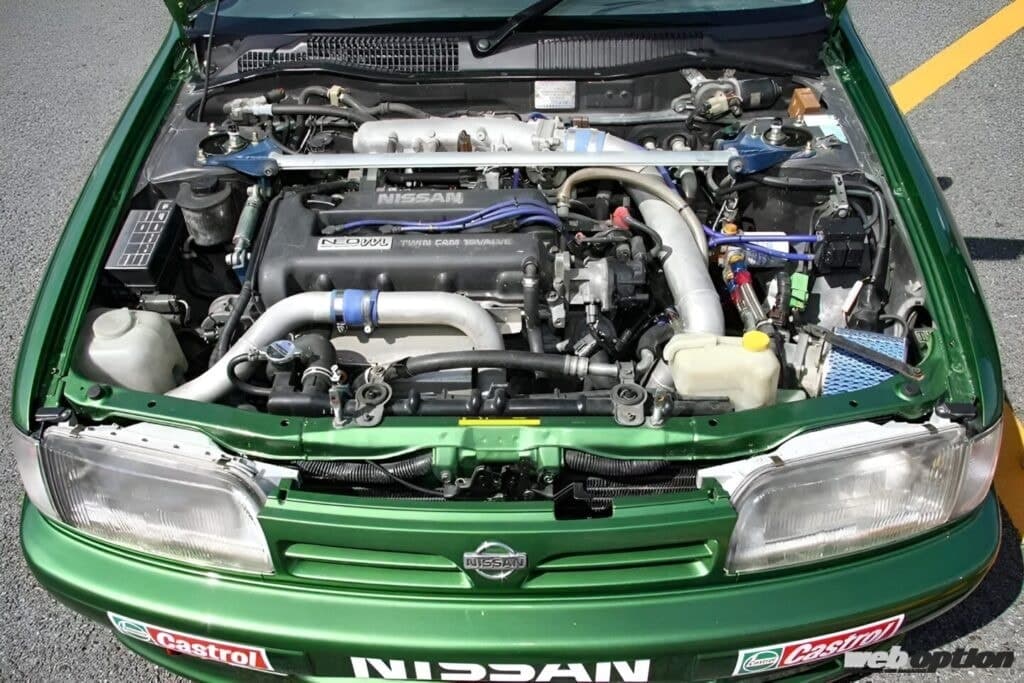 El motor es un SR20VE (procedente de un Primera P11) con compresión rebajada, turbo de S14, 1,2 bar de soplado y unos 300 CV aproximadamente. Cambio de alzada de levas a 4500 rpm, inyectores NISMO de 550 cc y un intercooler frontal.