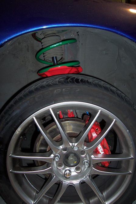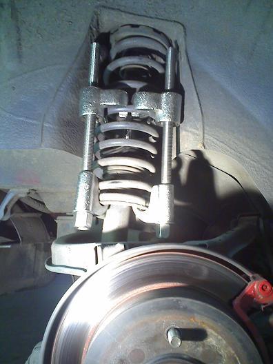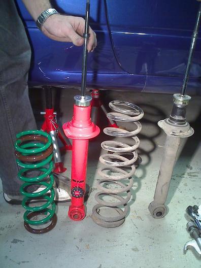 para las suspensiones recomiendo hacer dos y dos, porque si levantas el coche completo de delante la estabilizadora no te da por culo y se extienden del todo los muelles (aun así, siguen estando un pelo comprimidos y yo tuve q usar la compresora porque sino no habia cojones a sacarlos del sitio)… luego ya fuera es facil, sacas la copela, y la transplantas al nuevo kit… by the way, los muelles tein son casi la mitad de largos ql os de serie, a penas hace falta comprimir y al montar otra vez en el coche entran DIRECTOS!!!